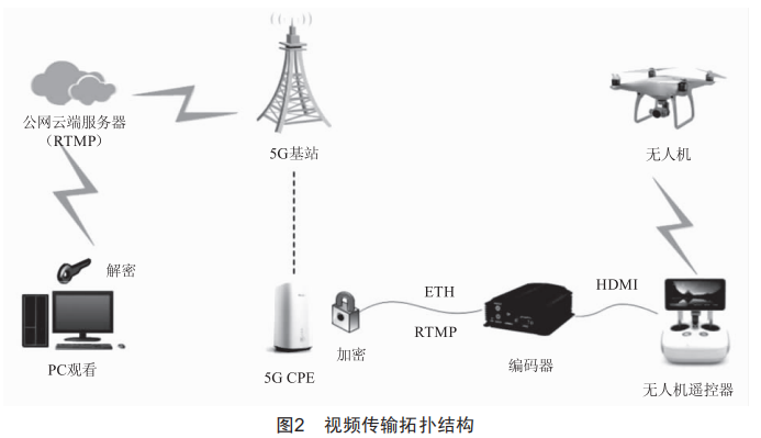 視頻傳輸拓?fù)浣Y(jié)構(gòu)如圖2所示,變電站智能巡檢無(wú)人機(jī)和無(wú)人機(jī)集控地面站部署在變電站內(nèi),圖像信息加密后,通過(guò)5G網(wǎng)絡(luò)發(fā)送。解密后,可在電力系統(tǒng)內(nèi)網(wǎng)訪問(wèn)進(jìn)行展示。其中編碼器將無(wú)人機(jī)提供的視頻信號(hào)轉(zhuǎn)換為視頻流,并向云端服務(wù)器推送視頻:5GCPE通過(guò)5G網(wǎng)絡(luò)為編碼器提供低延遲、高帶寬的穩(wěn)定傳輸環(huán)境:公網(wǎng)云端服務(wù)器通過(guò)云端服務(wù)器接收視頻流,轉(zhuǎn)儲(chǔ)后重新編碼,用戶再通過(guò)PC從該服務(wù)器拉流觀看巡查。