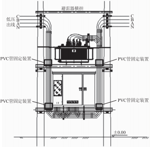 在現(xiàn)有配變臺(tái)架的進(jìn)出線PVC管安裝方式基礎(chǔ)上,研究了一種配變臺(tái)架進(jìn)出線PVC管固定裝置,其安裝位置具體如圖1所示。