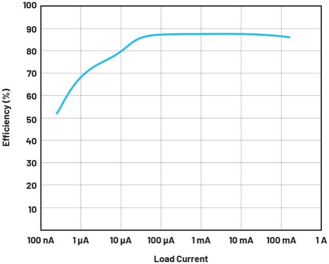 圖3.即使負(fù)載電流僅為1 μA,從7.2 V到2.5 V的電源轉(zhuǎn)換效率也達(dá)到了大約70%