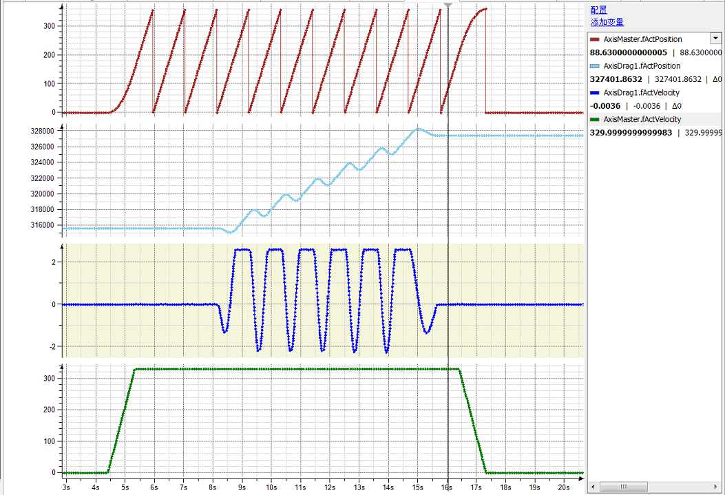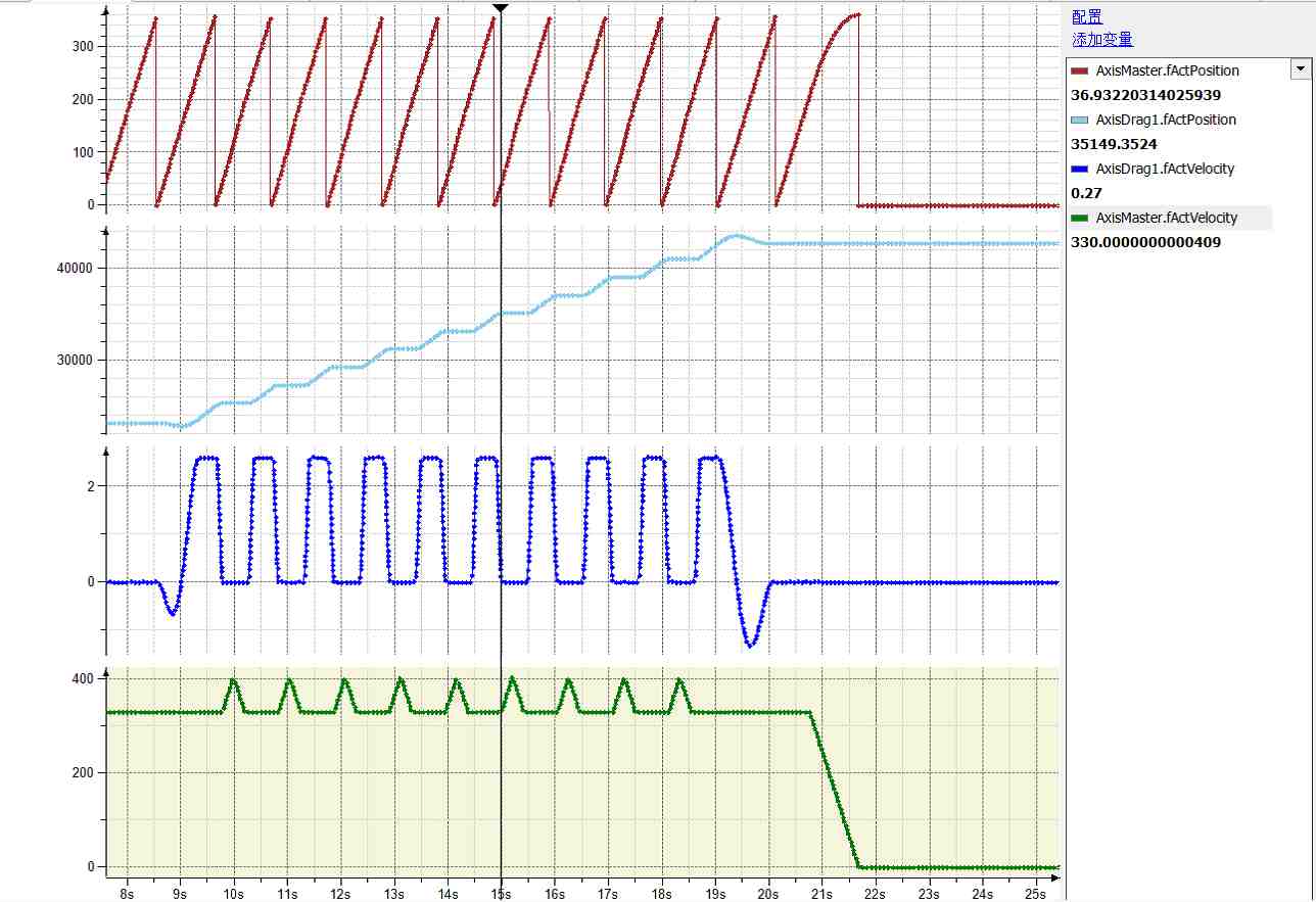 現(xiàn)在使用英威騰AX70中型PLC凸輪同步控制功能,可以使印刷輥與編制袋在印刷過程中始終處于同一生產(chǎn)速度,避免在加減速段照常印刷套色偏差,且在最高120米/分鐘生產(chǎn)速度下,全程套色偏差<0.8mm。