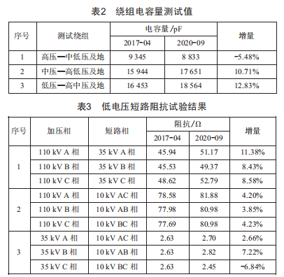 某110kV變壓器自2010年投入運行以來,多次受到中壓和低壓側(cè)的外部短路沖擊,且因短路引起的沖擊十分嚴(yán)重。根據(jù)現(xiàn)場檢測器采集的數(shù)據(jù)進(jìn)行相關(guān)分析,結(jié)果如表 1、表2、表3所示。
