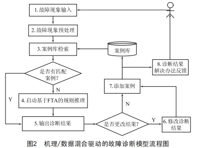 基于機(jī)理/數(shù)據(jù)混合驅(qū)動的故障診斷模型是故障診斷層的關(guān)鍵技術(shù),其整體思路為利用案例匹配和規(guī)則推理相結(jié)合的方式,首先輸入故障現(xiàn)象,然后檢索案例庫,尋找相似案例。若有相似案例 ,則快速獲得診斷結(jié)果及相應(yīng)檢修策略:若沒有合適的相似案例,則啟動規(guī)則推理,最終將推理產(chǎn)生結(jié)果作為診斷結(jié)果進(jìn)行輸出。該模型流程圖如圖2所示。
