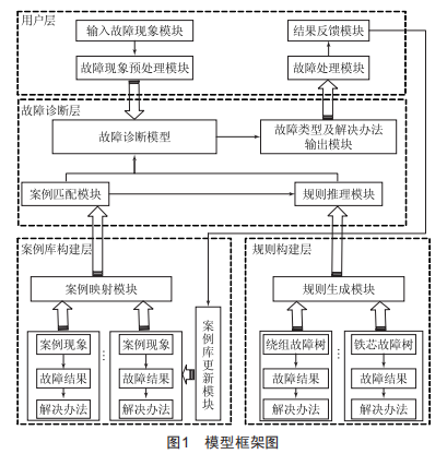 故障診斷層承接用戶層輸入,完成故障診斷并反饋結(jié)果給用戶層,是診斷系統(tǒng)的核心,包括故障診斷模型和故障類型及解決辦法輸出模塊。故障診斷模型核心是采用案例和規(guī)則串行推理的方式對故障進(jìn)行診斷并輸出診斷結(jié)果。故障類型及解決辦法輸出模塊主要負(fù)責(zé)將故障診斷結(jié)果 ,包括故障原因、故障解決辦法等信息輸出給用戶。