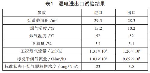 在濕電停一個(gè)電場(chǎng)的情況下,出口標(biāo)準(zhǔn)狀態(tài)干煙氣顆粒物濃度為1.5mg/Nm3,除塵效率達(dá)83.4%,So3脫除效率達(dá)80.37%。