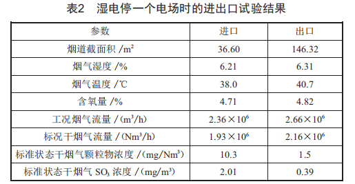 該濕電共設(shè)4個(gè)電場(chǎng)分區(qū),表2為濕電停一個(gè)電場(chǎng)時(shí),實(shí)測(cè)濕電進(jìn)出口煙氣流量、顆粒物和So3濃度等數(shù)據(jù)。