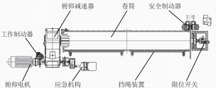 (2)臂架俯仰機構(gòu)。如圖2所示,變頻電機通過聯(lián)軸器來實現(xiàn)臂架的運動,其中臂架的仰起動作和放平動作由卷筒帶動。鋼絲繩在整個機構(gòu)中起到固定作用,一端固定于卷筒,另一端利用繩夾固定,其中鋼絲繩會穿過不同的滑輪組結(jié)構(gòu),將整個機構(gòu)支撐起來,并且在平衡裝置的輔助下進行運作。平衡裝置有補償卷筒誤差造成的鋼絲繩受力不均的作用,補償?shù)男谐掏ㄟ^設(shè)在上面的限位開關(guān)限定,當(dāng)該限位開關(guān)報警時,要及時檢查兩側(cè)的鋼絲繩長度并進行調(diào)整。