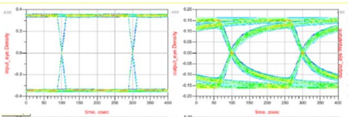 如下圖紅框所示在5Gbps信號情況下,PCB走線長度20mm時,接收信號的眼高是380mV,當(dāng)PCB走線長度是300mm時,接收信號的眼高已經(jīng)衰減到210mV,這已經(jīng)接近SLVS檢測門限。當(dāng)PCB走線長度500mm時,接收信號眼高衰減到100mV,此時SLVS Receiver已經(jīng)不能正常工作。