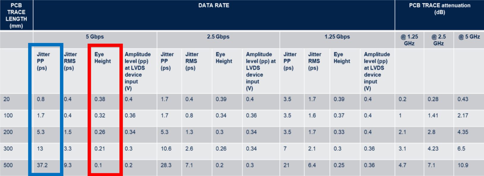 對抖動的影響。長的PCB走線會帶來更多的熱噪聲,這會增加抖動。如上圖藍框所示,5Gbps速率時,PCB走線長度從20mm變到300mm,抖動從0.8ps增加到13ps。5Gbps信號0.375UI抖動門限是75ps。300mm的PCB走線帶來的13ps抖動雖然遠遠小于75ps,但這僅僅是PCB走線引起的抖動。實際情況,如上面筆記本項目,SLVS走線很可能會經(jīng)過幾個電路板、接插件,難免會帶來串?dāng)_、不連續(xù)等效應(yīng),實際抖動情況遠比簡單的PCB走線嚴(yán)重。