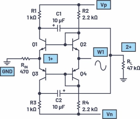 與ADALM2000(ADI公司)相連的電路及連接如圖1所示。NPN晶體管Q1和Q2以及PNP晶體管Q3和Q4應(yīng)從VBE匹配最佳的可用器件中選擇。在同一封裝中制造的晶體管,例如SSM2212、SM2220或CA3046,往往比單個(gè)器件匹配得更好。探究本電路的工作原理時(shí),示波器輸入1+可以連接到Q1和Q3發(fā)射極的連接點(diǎn),或連接到Q1或Q3的集電極。位于Q1和Q3的發(fā)射極連接點(diǎn)的電流輸入節(jié)點(diǎn)是標(biāo)稱低阻抗,因此它可以從電流源驅(qū)動(dòng)。ADALM2000的AWG輸出更像電壓源。因此,1 kΩ電阻RIN用于將AWG1的電壓輸出轉(zhuǎn)換為電流(IIN = VIN/1 kΩ)。