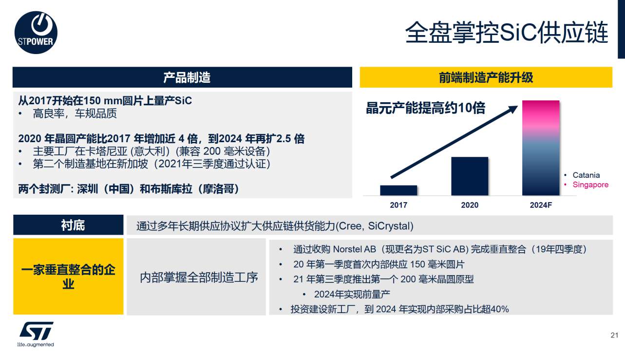完整的制造鏈戰(zhàn)略包括從前道的襯底加工道最后的封裝測試上,在整個制造鏈條上實現(xiàn)具備可控的實力,從而實現(xiàn)產能擴大。碳化硅襯底是制造鏈本身的重要組成部分,對芯片的成本、產量和質量影響很大。對于瑞典 Norstel AB公司(已更名為ST SiC AB)的收購,使ST擁有了前道的碳化硅襯底制造技術,并把這項技術融入其自己的制造鏈中。未來ST的碳化硅產品的部分襯底將會由該工廠提供,部分采購自第三方。