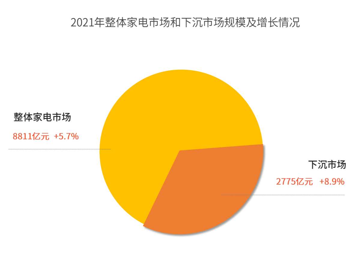 2021年,下沉市場快速增長、消費(fèi)升級激活高端市場成為拉動我國家電市場迅速走出低谷的兩大引擎。特別是占我國人口70%的下沉市場,2021年家電市場規(guī)模達(dá)到2775億元,同比增長8.9%,增幅遠(yuǎn)高于整體市場,是家電市場最具增長潛力的一極。