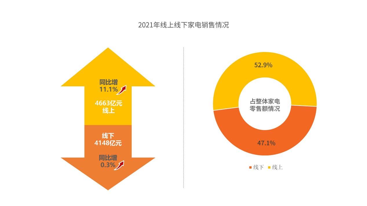 2021年,網(wǎng)絡(luò)零售在家電消費(fèi)中的地位進(jìn)一步提升,在疫情持續(xù)深刻影響下,家電線上市場規(guī)模登上新的高點(diǎn)。在全年家電零售額中,線上渠道貢獻(xiàn)了52.9%,滲透率穩(wěn)步提升。我國家電零售已經(jīng)形成“線上市場主導(dǎo)、線下市場輔助”的嶄新格局。