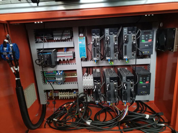 雙工位鞋底磨邊機(jī)使用我司AX70中型PLC通過EtherCAT總線方式帶6顆DA200伺服。