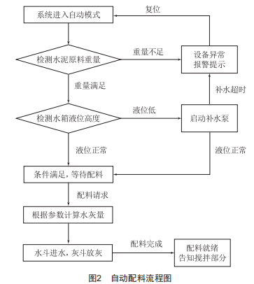 如圖2所示,系統進入自動模式后,系統檢測水泥罐內存儲的水泥原料重量是否滿足,不滿足的話,會報警待機,觸摸屏提示水泥原料存儲不足。如果重量滿足,系統開始檢測水箱內液位情況,液位低,就會啟動補水泵補水,補水超時會報警待機,觸摸屏提示補水超時:液位正?;蛘哐a水完成后,則等待請求配料。