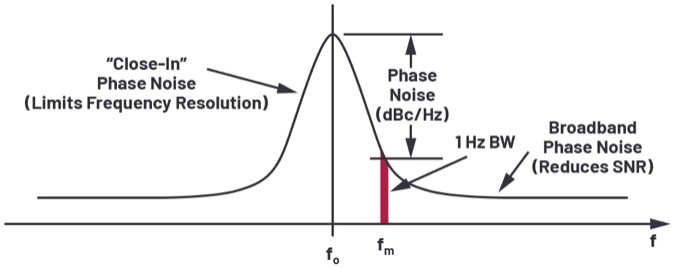 圖1展示了非理想型振蕩器的典型輸出頻譜,在1 Hz帶寬時(shí)噪聲功率與頻率成函數(shù)關(guān)系。相位噪聲的定義為指定頻率偏移fm下1 Hz帶寬內(nèi)的噪聲與基波頻率fo下振蕩器信號(hào)幅度的比率。