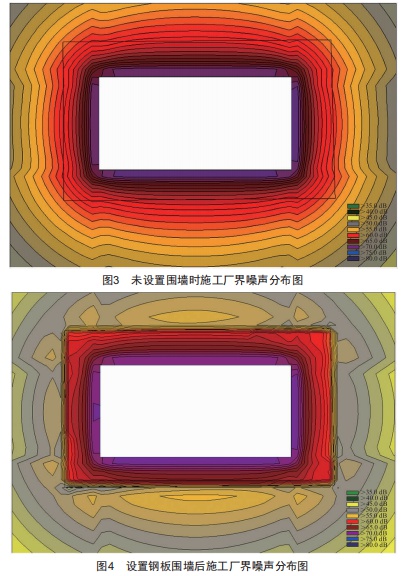 以建筑施工廠界為例,將施工噪聲等效為一四面體聲源(聲源高度2m),施工廠界(距離建筑面聲源10m位置處)設(shè)置2m高鋼板隔離墻,利用室外噪聲級(jí)預(yù)測(cè)軟件CadnaA對(duì)隔離墻安裝前后施工廠界噪聲進(jìn)行仿真預(yù)測(cè),結(jié)果如圖3、圖4所示。