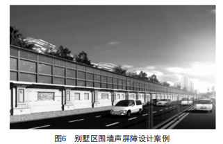 除廠界噪聲控制外,亦可利用圍墻靠近噪聲敏感點(diǎn)位置的地理位置優(yōu)勢(shì),對(duì)敏感點(diǎn)噪聲進(jìn)行有效控制。何金平等人在解決城市道路對(duì)某別墅小區(qū)噪聲干擾問題的項(xiàng)目中,在別墅區(qū)邊界設(shè)置了圍墻聲屏障(圖6),即采用3m高圍墻+3.5m高聲屏障的結(jié)構(gòu)型式,降噪量近10dB,效果顯著。