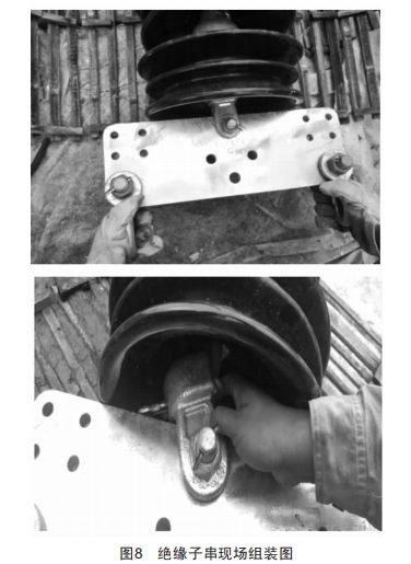 通過高跨線安裝仿真驗證技術(shù)的金具碰撞試驗發(fā)現(xiàn)金具組裝不匹配的問題后,現(xiàn)場施工人員采用了在碗頭掛板與聯(lián)板之間增加U型掛環(huán)的方法解決了這一問題,如圖9所示。
