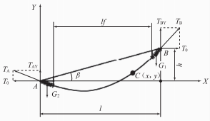 本文采用孤立檔軟母線非均布載荷模型,其受力分析如圖2所示。其中導(dǎo)線單位長度載荷為w0,線長10,導(dǎo)線整體載荷為w1=w010。導(dǎo)線兩端的耐張絕緣子載荷分別為G1、G2。導(dǎo)線兩端懸掛點有反力7A、7B,將其分解為垂直張力7AY、7BY和水平張力70。
