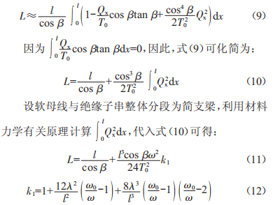 式中:1為孤立檔內(nèi)的絕緣子串、軟母線總長度(m):k1為連上絕緣子串后的軟母線增長系數(shù):o0為絕緣子串單位長度載荷(若絕緣子串為雙聯(lián)型式,o0按多聯(lián)串總體代入計算)(N/m):o為導(dǎo)線單位長度載荷(若導(dǎo)線為多分裂型式,o按多分裂總體代入計算)(N/m):A為檔內(nèi)導(dǎo)線一側(cè)的絕緣子串長度(m)。