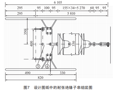 在高跨線安裝仿真驗證技術(shù)的金具碰撞試驗中發(fā)現(xiàn),16t懸瓷與圖7中④ws一16型碗頭掛板、⑤BN2一1640型聯(lián)板組合后,因16t懸瓷內(nèi)深大,達到4.5cm,而ws一16型碗頭掛板長度不足,只有9.5cm,聯(lián)板螺絲中心孔至邊緣距離為5cm,造成懸瓷與聯(lián)板接觸,絕緣子串實際無法按圖組裝,如圖8所示。