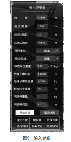 將本文設(shè)計的仿真軟件在某高壓變電站進行了試點應(yīng)用,以主變高跨間軟母線下料長度計算為例,各輸入計算參數(shù)如圖5所示。