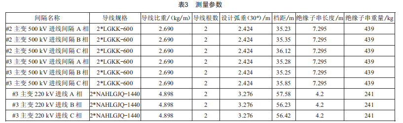 完成金具組裝后,利用高跨線放線仿真模塊進行增長量及開線長度計算和仿真,現(xiàn)場測量參數(shù)如表3所示。