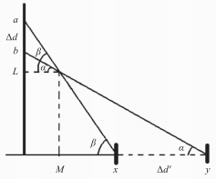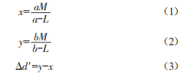 圖2中水平距離量x、y及角度a、8均為未知量,垂直距離量a、b、L及皿均為已知量,由于測(cè)試儀器內(nèi)部采樣直角三角形設(shè)計(jì),故不難得到x、y及水平位移距離Ad'的數(shù)學(xué)表達(dá)式:
