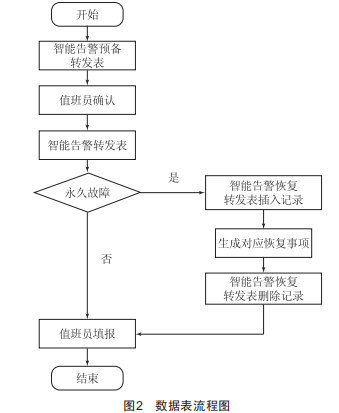 具體流程如圖2所示,當(dāng)產(chǎn)生智能告警事項(xiàng)時,智能告警集取服務(wù)將待確認(rèn)記錄存入智能告警預(yù)備轉(zhuǎn)發(fā)表,值班員確認(rèn)后,待確認(rèn)記錄存入智能告警轉(zhuǎn)發(fā)表,若故障為永久故障,則在智能告警恢復(fù)轉(zhuǎn)發(fā)表中插入一條記錄生成對應(yīng)恢復(fù)事項(xiàng)時從表中刪除記錄。