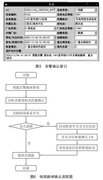 界面數(shù)據(jù)展示是基于智能告警結(jié)果提供可靠的數(shù)據(jù)來源。若有智能告警跳閘事項(xiàng),則分析該事項(xiàng)相關(guān)的量測點(diǎn)、測點(diǎn)關(guān)聯(lián)的設(shè)備、量測類型以及設(shè)備的連接關(guān)系。當(dāng)測點(diǎn)關(guān)聯(lián)的設(shè)備是開關(guān),且量測類型是開關(guān)狀態(tài)、開關(guān)連接的設(shè)備是線路或負(fù)荷時,則認(rèn)為當(dāng)前線路的當(dāng)前開關(guān)發(fā)送事故跳閘。當(dāng)線路永久故障開關(guān)斷開時,系統(tǒng)自動檢查開關(guān)分合位信息,當(dāng)檢測到開關(guān)合位和量測量大于0時,自動補(bǔ)充跳閘線路開關(guān)復(fù)電信息和恢復(fù)標(biāo)志(圖4)。同時,界面支持對智能告警跳閘事項(xiàng)的修改、新增、刪除等編輯功能,按照電網(wǎng)故障運(yùn)維人員需掌握的具體信息需求設(shè)計編輯內(nèi)容,包括廠站、線路雙編、故障類型、故障復(fù)電時間、故障相別和保護(hù)動作告警等關(guān)鍵內(nèi)容(圖5),以線路跳閘為例,以是否為永久故障作區(qū)分,推送確認(rèn)流程至值班員(圖6)。