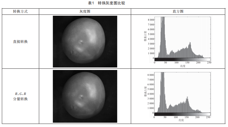 如表1所示,兩種方法得到的圖像差異不大,其圖像直方圖形狀、范圍基本一致。直方圖的差異在于第二次波峰處,直接轉(zhuǎn)換方法下得到的直方圖第二次波峰出現(xiàn)在亮度16l處,亮度值位置的像素占量為3279:R、G、B分量轉(zhuǎn)換方法得到的直方圖第二次波峰出現(xiàn)在亮度l49處,亮度值位置的像素占量為3475。同時(shí),直接轉(zhuǎn)換方法下得到的直方圖截止范圍出現(xiàn)在亮度223處,亮度值位置的像素占量為95:R、G、B分量轉(zhuǎn)換方法下得到的直方圖截止范圍出現(xiàn)在亮度2l5處,亮度值位置的像素占量為57。
