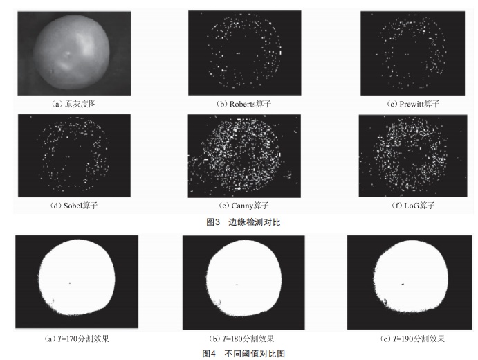 工業(yè)測(cè)量中,當(dāng)背景取與目標(biāo)體對(duì)比較大的單一色時(shí),采用閾值分割效果較好,故圖像分割中采用閾值分割法。通過原圖直方圖尋找合適的閾值,原圖直方圖中兩個(gè)波峰相距較遠(yuǎn),在色彩灰度范圍l70~200之間出現(xiàn)波谷,分別取T=170、T=180、T=l90作為全局閾值比較。取T=l70時(shí),番茄的分割圖像邊界不夠明顯,圖像左下角出現(xiàn)邊緣范圍較寬的毛刺,圖像內(nèi)部出現(xiàn)較少孤立點(diǎn):取T=l90時(shí),番茄圖像的邊界變得清晰,圖像左下角毛刺范圍逐漸增大,毛刺點(diǎn)變多從而顏色變深,圖像內(nèi)部出現(xiàn)更多孤立點(diǎn):取T=l80時(shí),閾值分割效果最好。不同閾值對(duì)比圖如圖4所示。