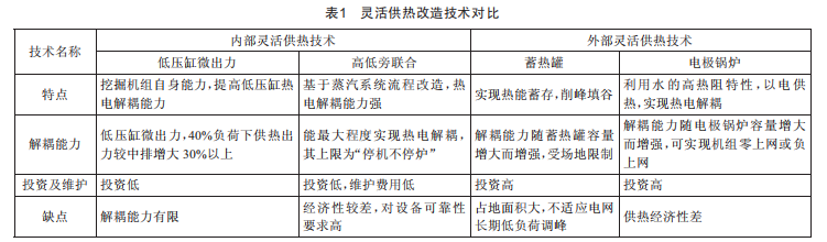 提高低位能供熱技術(shù)的熱電解耦性能,可從改善機(jī)組自身供熱特性、借助靈活調(diào)峰輔助技術(shù)兩種思路展開研究。目前靈活調(diào)峰輔助技術(shù)有高低旁聯(lián)合供熱技術(shù)、蓄熱罐供熱技術(shù)、電極鍋爐供熱技術(shù)等。與低位能系統(tǒng)匹配的靈活供熱改造技術(shù)分為內(nèi)部靈活技術(shù)和外部靈活技術(shù),綜合對比如表1所示。低壓缸微出力和高低旁聯(lián)合均具備連續(xù)調(diào)峰性能,且投資省,建議優(yōu)先選用。在充分挖掘內(nèi)部潛力的情況下仍不能滿足電網(wǎng)調(diào)峰要求的,可考慮采用蓄熱罐、電極鍋爐等外部輔助供熱技術(shù)。