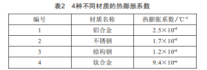 為了分析不同材質(zhì)的工裝在加熱溫度為180℃條件下的變形情況,分析選取了3種常見的工裝材質(zhì)進行計算,分別為鋁合金、不銹鋼、結(jié)構(gòu)鋼、鈦合金,3種材質(zhì)的熱膨脹系數(shù)如表2所示。