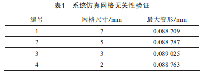 為了驗證仿真的可行性和有效性,對使用ANSyS進行劃分的網(wǎng)格做了網(wǎng)格劃分與仿真結(jié)果的無關(guān)性驗證分析,網(wǎng)格無關(guān)性驗證結(jié)果如表1所示。