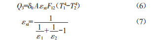式中:07為輻射換熱量:S0為斯蒂芬一玻耳茲曼常數(shù),S0=2.68×10-8:A為物體輻射換熱的表面積:Sxt為系統(tǒng)發(fā)射率,其中S1、S2分別為高溫物體表面和低溫物體表面的發(fā)射率:F12為表面1到表面2的角系數(shù):r1、r2為表面1、表面2的絕對溫度。