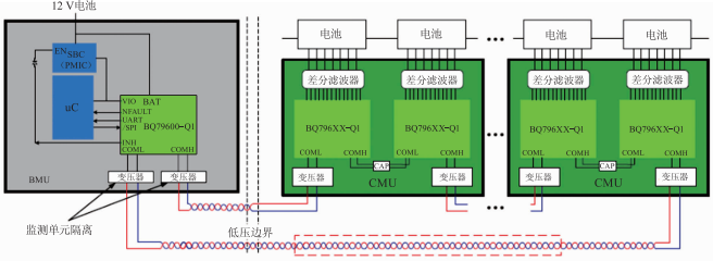 在圖2中,左側(cè)為電池管理或監(jiān)測單元(BMU)板,其中包括主機MCU和B079600-01通信橋接器件。此BMU連接MCU和單節(jié)電池監(jiān)測單元(CMU)上其他B0796XX監(jiān)測器件,而CMU與實物電池連接。這些CMU通過雙絞線菊花鏈電纜在每個電池監(jiān)控器件的高側(cè)和低側(cè)互聯(lián),也可使用環(huán)形電纜,在電纜斷開時向任一方向傳輸數(shù)據(jù)。另外,需要在菊花鏈電纜的任一端添加隔離元件,用來確保在高噪聲環(huán)境中的可靠通信,并承受嚴(yán)格的汽車電磁干擾(EMI)和電磁兼容性(EMC)限制。