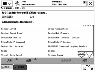 ABB工業(yè)機(jī)器人常用的標(biāo)準(zhǔn)I/0板主要有5種[2],除了在設(shè)置時(shí)給它們分配的地址不同以外,它們的配置方法基本相同。本文主要對(duì)ABB標(biāo)準(zhǔn)I/0板DS0C652進(jìn)行分析,該板主要基于DeviceNet網(wǎng)絡(luò)構(gòu)建通信模塊。DS0C652板具有分布式I/0模塊,有16個(gè)數(shù)字輸入和16個(gè)數(shù)字輸出接口,該板安裝在ABB工業(yè)機(jī)器人控制柜里。首先,定義DS0C652板具體操作步驟,進(jìn)入示教器控制面板,然后進(jìn)入配置菜單(圖1),選中DeviceNetDevice菜單,添加模板進(jìn)入圖2。ABB標(biāo)準(zhǔn)I/0板是掛在DeviceNet網(wǎng)絡(luò)上的,所以要設(shè)定模塊在網(wǎng)絡(luò)中的地址。端子x5的6~12的跳線用來(lái)決定模塊的地址,地址可用范圍在10~63,在模板參數(shù)里修改參數(shù)完成DS0C652板設(shè)置。單擊選擇"使用來(lái)自模板的值"行的下拉菜單,選擇"DS0C65224VDCI/0Device",然后需要設(shè)置的參數(shù)有I/0板在總線中的地址。