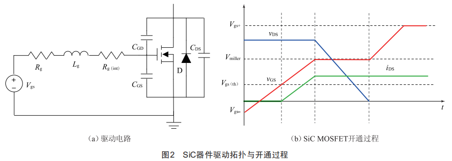 本節(jié)以siCMosFET驅(qū)動為例,提出了一種變驅(qū)動電阻抑制超調(diào)的驅(qū)動方案。驅(qū)動硬件電路如圖2(a)所示,其中Vgs為驅(qū)動電源,Rg為外接驅(qū)動電阻,1g為回路感抗,Rg(int)為siC器件內(nèi)部柵極電阻,CGs、CGD、CDs分別為柵源、柵漏、漏源間寄生結(jié)電容,D為寄生等效反并二極管。siC器件的開通過程如圖2(b)所示,開通前驅(qū)動電壓為負(fù)壓Vgs-,當(dāng),Gs>Vgs(th)時,漏源電流iDs開始上升,之后,Gs達(dá)到米勒平臺電壓Vmi11er,結(jié)電容CGD開始放電,,Ds下降,此時,Gs保持不變,在,Ds下降到0后,米勒平臺結(jié)束,,Gs繼續(xù)上升至驅(qū)動電壓Vgs+。