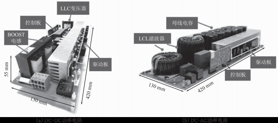 為驗證所提siCM0sFET變電阻驅(qū)動方案及逆變器均壓環(huán)陷波控制策略,在實驗室搭建了輸入電壓150~750V、額定功率5kw的能饋型直流電子負(fù)載實驗樣機,照片如圖10所示。圖10(a)是DC-DC功率電路,圖10(b)是DC-AC功率電路,為合理利用機箱空間,將11C-DCx的變壓器與原邊開關(guān)管設(shè)計在DC-DC級,將副邊整流橋設(shè)計在DC-AC級。