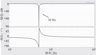 由于50Hz頻率不高,低通濾波器難以兼顧低頻高增益與50Hz處的低增益,本文設(shè)計50Hz陷波器,針對這一特定頻率進(jìn)行過濾。該50Hz陷波器的伯德圖如圖9所示,可以看出其極大地降低了50Hz處的增益,而不影響其他頻率,既能有效實現(xiàn)電容電壓直流分量均衡,又能避免該方案引入的諧波。