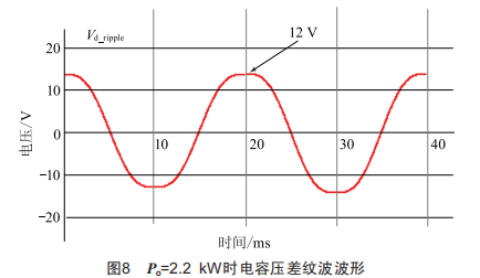 為了量化分析,將Ig=10A,c1=2.34mF,og=100m,7g=20ms代入式(9),繪制電容壓差紋波,如圖8所示。觀察到并入220V交流電網(wǎng),并網(wǎng)功率Po=2.2kw時,電容壓差紋波最大為12V,峰峰值為24V。