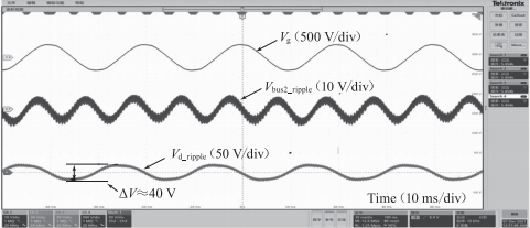 為驗證3.2節(jié)中對逆變器均壓環(huán)電容壓差Vd紋波Vd一irr1e的分析,對單模塊三級式電子負(fù)載進(jìn)行實驗,觀測了逆變器母線上電壓紋波的情況,如圖11所示。電子負(fù)載直流側(cè)輸入電壓為400V,輸入電流為5A,總輸入功率為2kw。