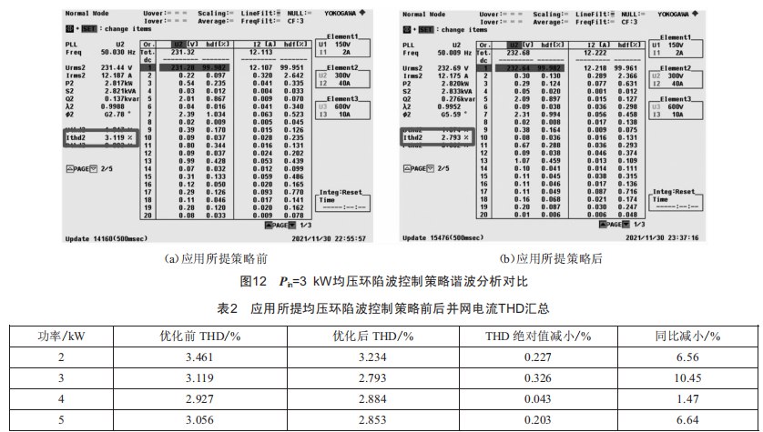 為驗證4.4節(jié)所提T型三電平逆變器均壓環(huán)陷波控制策略,對應(yīng)用該策略前后的并網(wǎng)電流THD進(jìn)行測試與對比。在逆變器輸出側(cè)串接功率分析儀,以讀取電流THD數(shù)值。