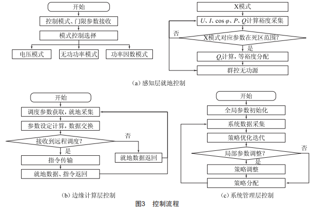 (1)感知層就地控制流程如圖3(a)所示,初始化接收調(diào)度控制模式及設定門限參數(shù),支持默認模式選擇,在給定控制模式下實時計算相關輸入量(包括電壓、無功功率或功率因數(shù)),根據(jù)設定門限參數(shù)及裕度計算目標值,并按照等比例裕度原則分配目標值,下發(fā)至無功源側(cè)響應,完成一次就地控制,采用多次PID控制保證穩(wěn)態(tài)精度。(2)邊緣計算層控制流程如圖3(b)所示,初始化獲取調(diào)度參數(shù),實時采集本地線路電氣量,轉(zhuǎn)發(fā)參數(shù)和電氣量,同時監(jiān)視調(diào)度遠程控制指令。當無調(diào)度指令時,只負責將就地電氣量數(shù)據(jù)返回調(diào)度監(jiān)控系統(tǒng):當接收到調(diào)度指令時,完成就地指令和透傳指令識別,就地指令就地響應,透傳指令下發(fā)至歸屬邊緣層設備或集中器,并監(jiān)視邊緣層返回指令及功率返回采集值,實時更新本地數(shù)據(jù)并實現(xiàn)與調(diào)度交互。(3)系統(tǒng)管理層控制流程如圖3(c)所示,系統(tǒng)管理層負責全管理范圍內(nèi)線路參數(shù)初始化,采集系統(tǒng)數(shù)據(jù)并進行潮流分析,制訂系統(tǒng)無功電壓優(yōu)化策略,在無局部參數(shù)調(diào)整時進行策略迭代和分配,在需要局部參數(shù)調(diào)整時,根據(jù)迭代參數(shù)及局部數(shù)據(jù)分析進行策略調(diào)整并完成重新分配。