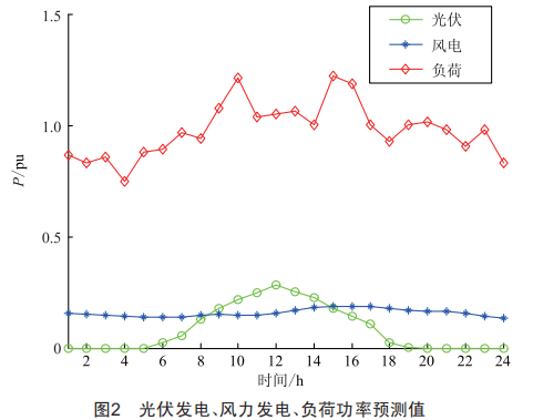 如圖2所示,間歇性能源與負(fù)荷隨時間而波動,二者的峰值將在不同時段出現(xiàn)。當(dāng)負(fù)荷出現(xiàn)峰值而間歇性能源出力較弱時,重負(fù)荷需要通過首端配變根節(jié)點輸送功率,進(jìn)而拉低負(fù)荷節(jié)點電壓,引起較大的網(wǎng)絡(luò)損耗。而當(dāng)間歇性能源達(dá)到峰值時,因負(fù)荷較輕而棄風(fēng)、棄光。