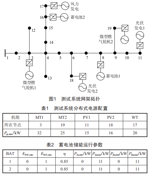 利用運籌學(xué)建模求解軟件GAMs,搭建本文所提的MIoCP模型。以修改后的西門子Benchmark低壓系統(tǒng)[7]作為本文的測試系統(tǒng),其額定電壓為0.4kV,額定基準(zhǔn)容量為100kVA。配置的DG如圖1所示,以日前24h作為算例的求解時間區(qū)間,測試系統(tǒng)的電源參數(shù)如表1、表2所示。