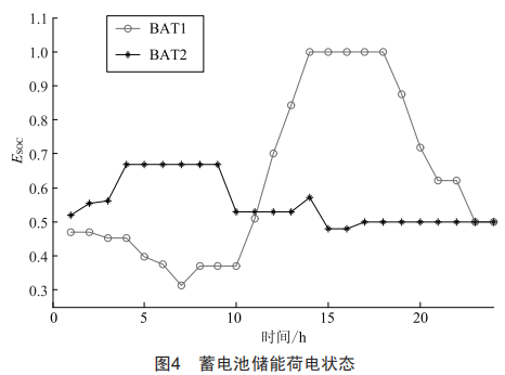 圖3所示為DG在不同時段下的功率輸出情況,圖中PV和wT受不同時段的出力限制,MT為全功率輸出。圖4所示為蓄電池在一天24個時段的荷電狀態(tài)分布,兩個蓄電池相互協(xié)調(diào),在負(fù)荷較重時放電,在負(fù)荷較輕、間歇性能源充足時充電。結(jié)合圖3和圖4分析可知,蓄電池儲能根據(jù)主動配電網(wǎng)中的負(fù)荷需求及DG的出力大小做出充電/放電響應(yīng)。