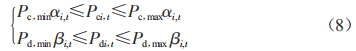 式中,Pc,max和Pc,min分別表示充電功率的上下限:Pd,max和Pd,min分別表示放電功率的上下限:Pci,1和Pdi,1分別表示時段1在節(jié)點i上蓄電池的充、放電功率。