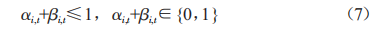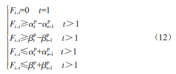 為了進(jìn)一步表示蓄電池的狀態(tài)轉(zhuǎn)換過程,引入0-1變量Fi,4以記錄蓄電池的充放電過程切換,即當(dāng)且僅當(dāng)aEQ \* jc3 \* hps10 \o\al(\s\up 3(1=1、aEQ \* jc3 \* hps10 \o\al(\s\up 3(=0或者aEQ \* jc3 \* hps10 \o\al(\s\up 3(1=0、aEQ \* jc3 \* hps10 \o\al(\s\up 3(=1時,蓄電池才發(fā)生充放電過程的切換,則Fi,4滿足以下約束條件: